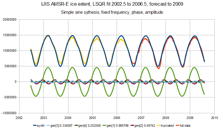 Explaining very simply, the data from 2002.5 through to 2006.5 is least square best fit with the sum of 4 sine wave generators, the dark blue graph line. These are constant in frequency, phase and amplitude for the whole graph.