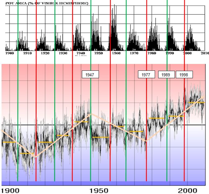 From the figure above it can be seen that the regime changes correspond to the onset of solar cycles and occur when the “butterfly” is at its widest. The most significant warming regime shifts occur at the start of odd-numbered cycles (1937, 1957, 1977, 1997). Each odd-numbered cycle (red lines above) has resulted in a temperature-increase regime shift. Even-numbered cycles (green lines above) have been inconsistent, with some resulting in temperature-decrease regime shifts (1902, 1946) or minor temperature-increase shifts (1926, 1987).