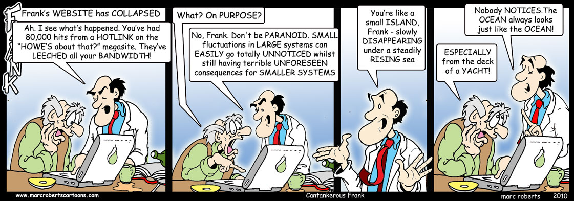 REPLY: Well I’ll point out that Revkin hotlinked at Dot Earth first, and I followed, using the source Revkin provided. When Mr. Roberts asked, I immediately fixed it for him. It really is unfortunate that WUWT is so traffic laden that it hurt his old website. It was unintentional. I figured if it was on NYT, he could handle the load. Copying it locally risks copyright issues for original artwork, so I didn’t want to do that. On the plus side, he’s now upgraded to a blogger based website, and he can handle the traffic now. Steve McIntyre suffered from the same problem on a single box server, and now uses wordpess.com like I do.