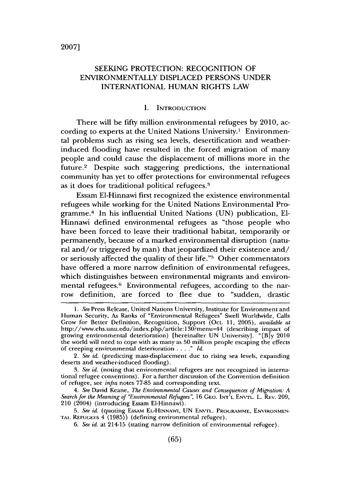 Brooke Havard, 18 Vill. Envtl. L.J. 65 (2007) Seeking Protection: Recognition of Environmentally Displaced Persons under International Human Rights Law