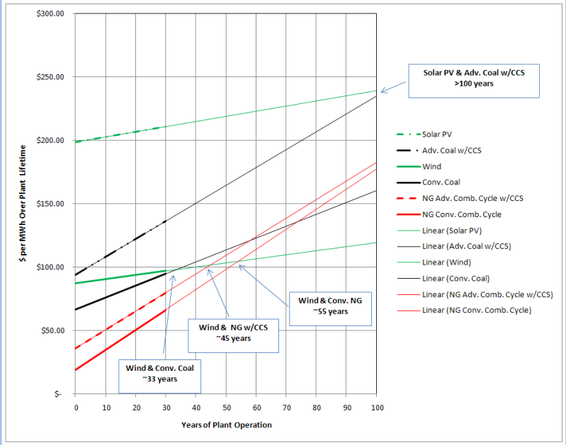 According to the DOE numbers, solar PV will take more than 100 years to catch up to advanced coal with carbon capture and storage. It never catches up to conventional coal or conventional natural gas with carbon capture and storage.
