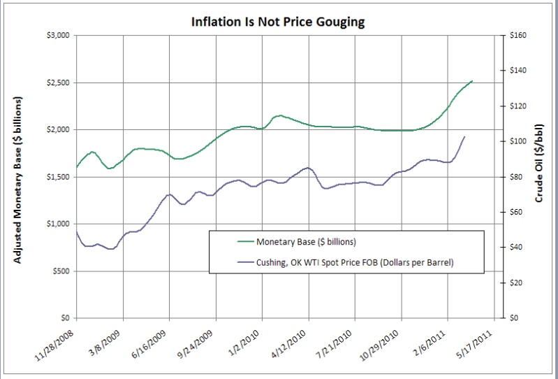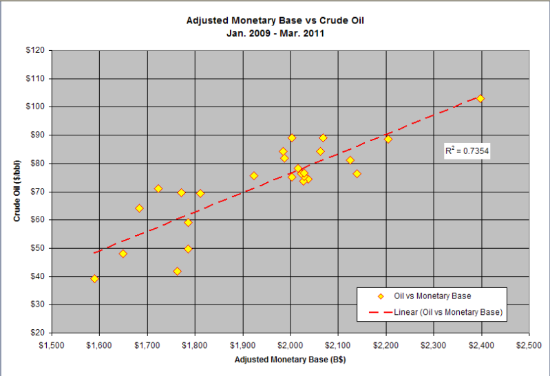 “Most of the oil price rise was due to quantitative easing. Since January 2009, the price of oil has almost exactly tracked the Adjusted Monetary Base.
