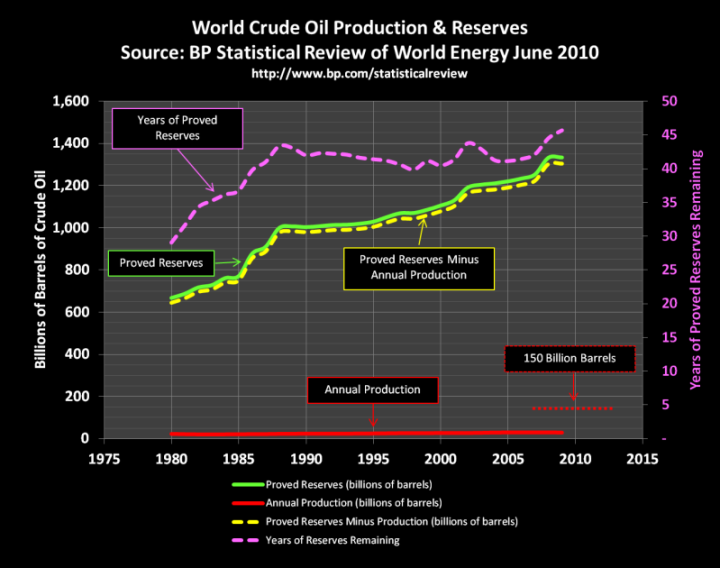 The “world” isn’t running out of anything. Global proven oil reserves have doubled since 1980.