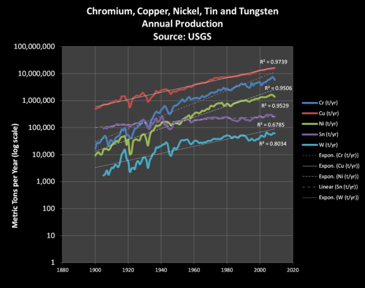 You wrote “More importantly, from a scarcity perspective, the production output of all five metals has been rising over time. Four are rising exponentially”