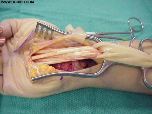 Besides Alexander and Feldenkrais techniques as long term physical therapy w/o the New Age fluff, weight loss via low carb cuisine is highly recommended. This graphic surgical image shows how yellow fat blobs basically tighten up the whole wrist area: