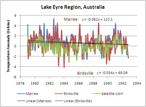 So … here’s the deal. We have no evidence that the temperatures are rising in the Lake Eyre region. There has been little change in the area temperatures since the satellite records began. Despite that, University of Adelaide professors are selling their fantasies of a terrifying future to the Arabunna, the aboriginal people who live in the area.