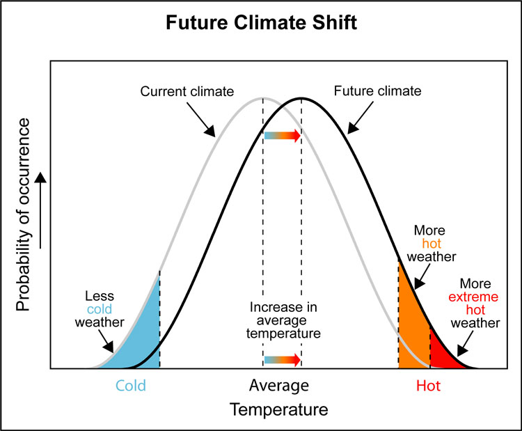 Why, on the shift shown by his two bell curves, does Cliff Mass describe the right end as “More extreme hot weather” yet at the left end he says “Less cold weather”. What subliminal desire causes him to use the word ‘extreme’ only in relation to ‘hot weather’?