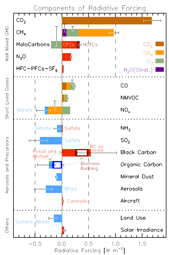 Now take a look the radiative forcing table from any one of the IPCC reports, where the explanatory variables that get included in the IPCC computer models are laid out. You will see that the only solar forcing effect listed is “solar irradiance.” In AR5 this table is on page 8-39: