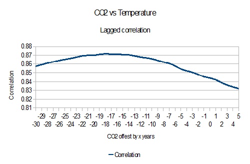 2) In fact, images in which rises in CO2 precede rises in temperature are very easy to come by. You just need to plot the rise of both over the twentieth century, as in this example. It is even possible to determine that the best fit between annual CO2 and temperature data (HadCRUT4) is found when the temperature data lags the CO2 data by 18 years.