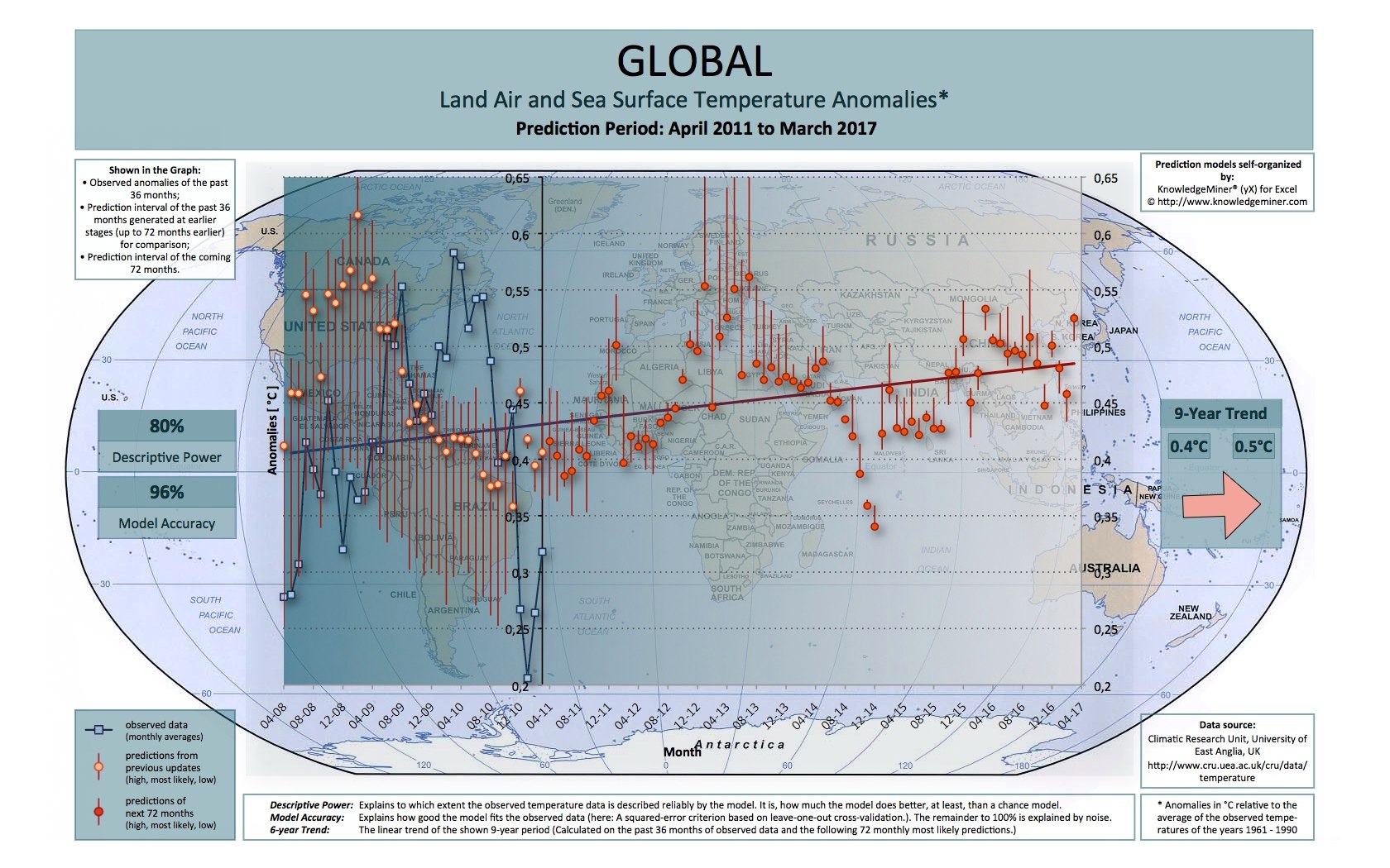 In September 2011, we presented a medium-term (79 months) quantitative prediction of monthly global mean temperatures based on an interdependent system model of the atmosphere developed by KnowledgeMiner, which was also discussed at Climate Etc. in October 2011. This model describes a non-linear dynamic system of the atmosphere consisting of 5 major climate drivers: Ozone concentration, aerosols, radiative cloud fraction, and global mean temperature as endogenous variables and sun activity (sunspot numbers) as exogenous variable of the system. This system model was obtained from monthly observation data of the past 33 years (6 variables in total: the 5 variables the system is actually composed of (see above) plus CO2, which, however, has not been identified as relevant system variable), exclusively, by unique self-organizing knowledge extraction technologies.