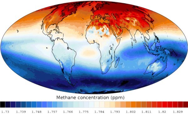 I was intrigued to recently find this map of global methane concentrations. The area over the Arctic shows the highest concentrations – is the cause: i) industrial activity in the northern hemisphere, and/or ii) the alarmist wet dream of methane hydrates evaporating off the ocean floor, and/or iii) methane venting out of hydrothermal vents on the Arctic ocean floor?