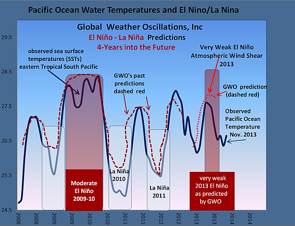 The World Meteorological Organization (WMO) provides the following summary of their ENSO forecasts in their January 30, 2014 El Niño/La Niña Update: