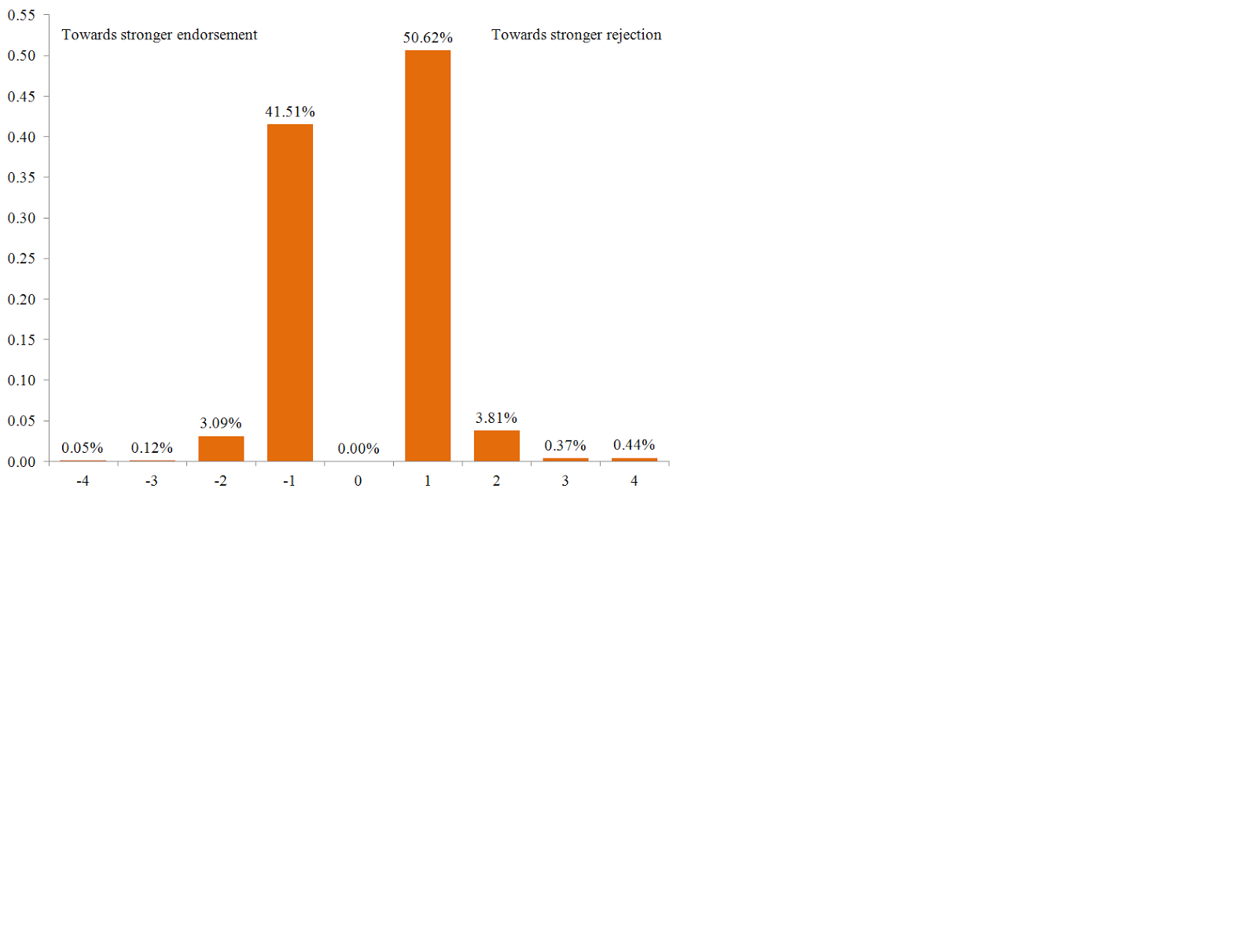 Secondly the maths is bad. 2 people rated each abstract. In the case where the rating differed they went through a 1st reconciliation stage where the raters discussed and tried to agree on a single rating. Tol examined the reconciliation stage and looked at how the papers resolved in this stage were correct. Obviously one of the 2 raters would see their rating changed. Tol created this histogram of how each rating changes.