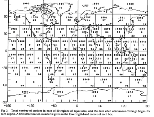 A third is HADCRUT doesn’t just average over all cells (but GISTEMP does). Rather it computes separate average temperatures for the Northern versus Southern Hemispheres, then averages these together. If there are missing cells, this reduces the error associated with a changing geographical bias over time (in early data, much of the Southern Hemisphere was missing over land), and the associated bias in temperature trend that arises do to polar amplification.