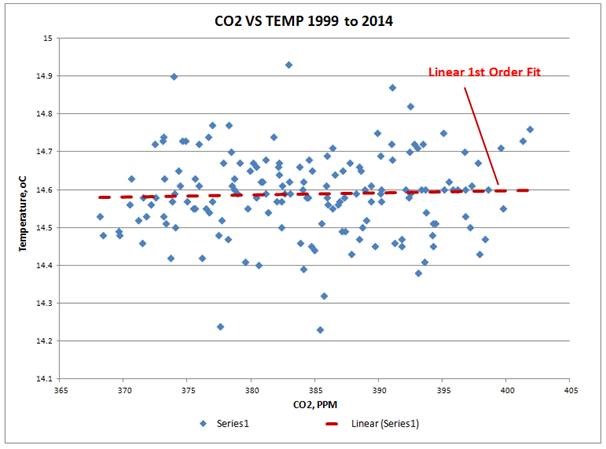 In “statistician speak” the correlation between CO2 and temperature is not significantly different than zero. Specifically for the period 1998-2014 (to date) the XY plot has an R squared of 0.0068. The AR5 climate sensitivity is 2-4.5oC for a doubling of CO2, with most like value of 3oC, whereas these data suggest a value more like 0.4 oC for a doubling of CO2 (which is indeed meaningless given the R squared).