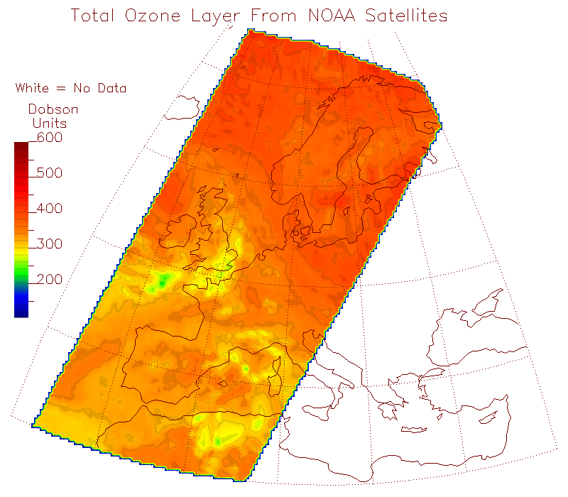 The green color in those NASA graphs are around the 400 DU. Normally, 250 DU are light blue. And dark blue is around 150-120 DU. But those low values are only seen during the Antarctic spring and go away at late spring. But over continents in moderate latitudes (ie: France, Germany, etc) the ozone concentratrion can be as high as 500 DU. For example, on June 6th, 2005 oozne values over Europe were these: