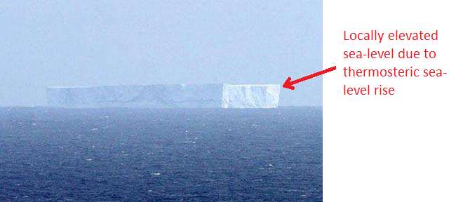 The thing is, thermal expansion of the upper ocean does not affect sea-level elsewhere. Rather, when the density of the water in the upper layer of the ocean changes, the water rises or falls in place, because gravity balances mass, not volume. This is most dramatically visible in the case of ice, but it’s just as true for liquid water.