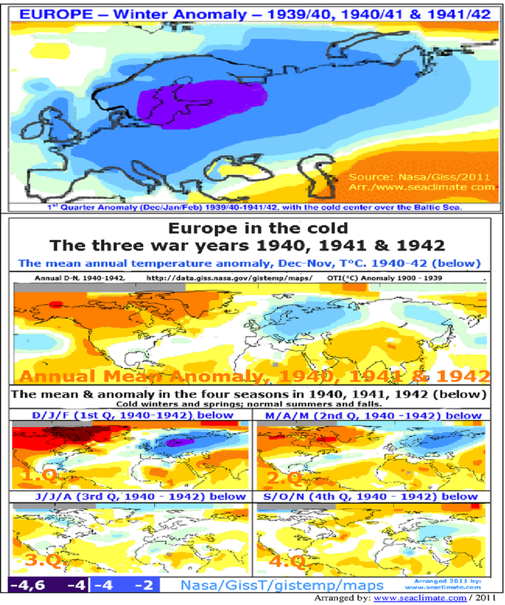 Even James Hansen calculated the start of the global cooling since 1940, which is primarily due to three extreme cold winters in Europe beginning 1939/40 only four months after WWII started. Here is a global winter temperature map for the first three war years. http://www.seaclimate.com/b/images/buch/big/B_3.png