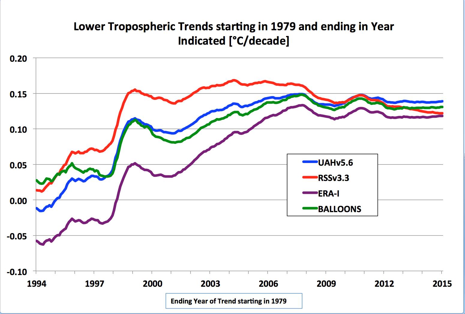 Now, setting aside the fact that (1) we actually do adjust for obvious, demonstrable errors as soon as they have been found (unlike the IPCC climate modelers who continue to promote demonstrably wrong models), and (2) RSS gets about the same (relatively benign) warming trend as we do, let’s examine some other popular temperature datasets in the same manner as the above graph: