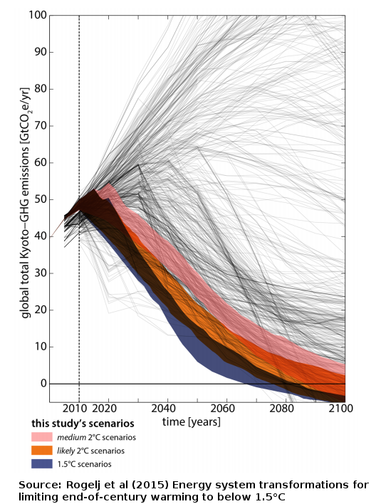 Reference: Rogelj J, Luderer G, Pietzcker RC, Kriegler E, Schaeffer M, Krey V, Riahi K. (2015). Energy system transformations for limiting end-of-century warming to below 1.5°C. Nature Climate Change. 21 May 2015. DOI: 10.1038/NCLIMATE2572