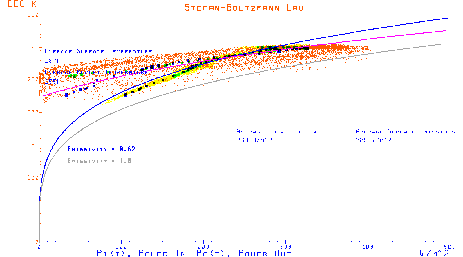 When I first saw FS = 390 W m–2 in Kiehl & Trenberth (1997), I deduced it was derived from observed global mean surface temperature 288 K using Eq. (1), assuming surface emissivity εS = 1. Similarly, TS = 289.5 K gives 398 W m–2.
