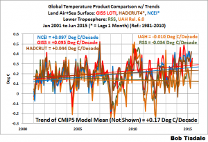 Guest Post by Bob Tisdale This is the June 2015 Global Surface (Land+Ocean) and Lower Troposphere Temperature Anomaly & Model-Data Difference Update, but in it we’re presenting the new GISS … Continue reading Both NOAA and GISS Have Switched to NOAA’s Overcooked “Pause-Busting” Sea Surface Temperature Data for Their Global Temperature Products