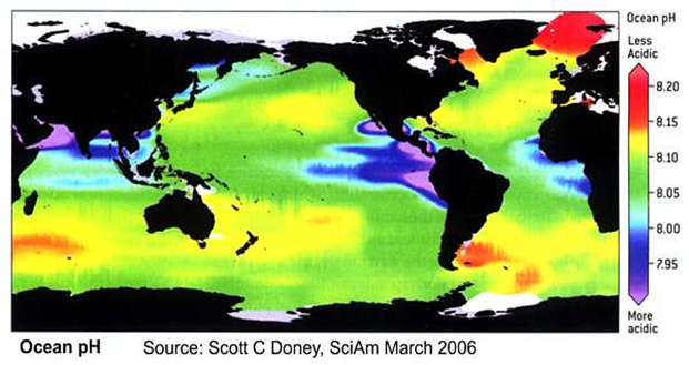 Even taking the different color schemes into account, here is very little resemblance between the measured surface CO2 and the estimated pH of the surface seawater. That is, in part, because the effects of atmospheric CO2 are overwhelmed by photosynthetic activity, which consumes dissolved CO2, and upwelling from deep, cold, oxygen-depleted waters enriched in CO2 from the decomposition of organic matter. See the graphic immediately below and compare with the above. Note also that the Scientific American graphic gives no acknowledgment to the alkalinity of the seawater despite the pH range shown being entirely in the region of basic solutions!
