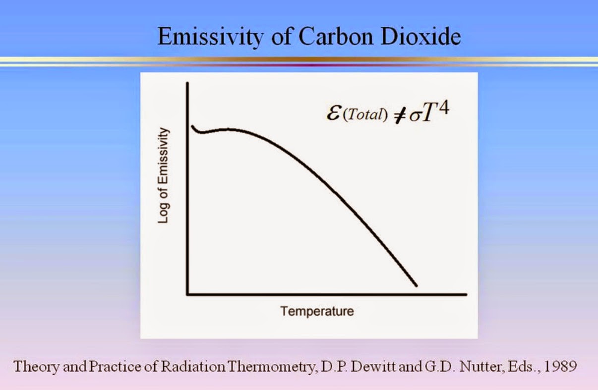 First of all, the SB Law for TRUE BBs or greybodies is absolutely NOT applicable to CO2 (or H2O) MOLECULES, and as proven by observations, emissivity decreases with temperature, unlike a true blackbody: