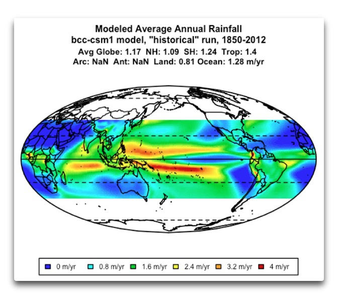 Next, I got rainfall data from a random model to see what the ITCZ looked like in the model output. It’s the bcc-csm1 model, chosen because they were listed alphabetically and I took the first one. I’ve trimmed the model output to 40°N to 40°S to match the TRMM data to allow easy and accurate comparison.