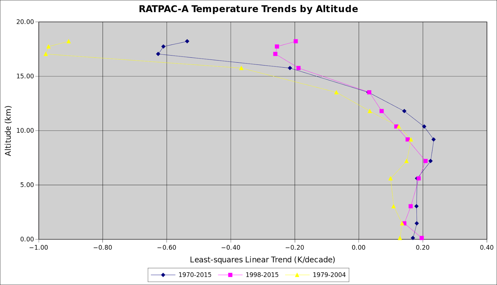 Pres Lvl 1970-2015 1998-2015 1979-2004 -------- -------- -------- -------- 1000 0.17 0.20 0.13 850 0.18 0.14 0.14 700 0.18 0.16 0.11 500 0.18 0.19 0.10 400 0.22 0.21 0.15 300 0.23 0.15 0.16 250 0.20 0.12 0.13 200 0.14 0.07 0.03 150 0.03 0.03 -0.07 100 -0.22 -0.19 -0.37 70 -0.63 -0.26 -0.98 50 -0.61 -0.26 -0.97 30 -0.54 -0.20 -0.91Plot of above data, subbing pressure level with altitude in km based on a standard atmosphere: