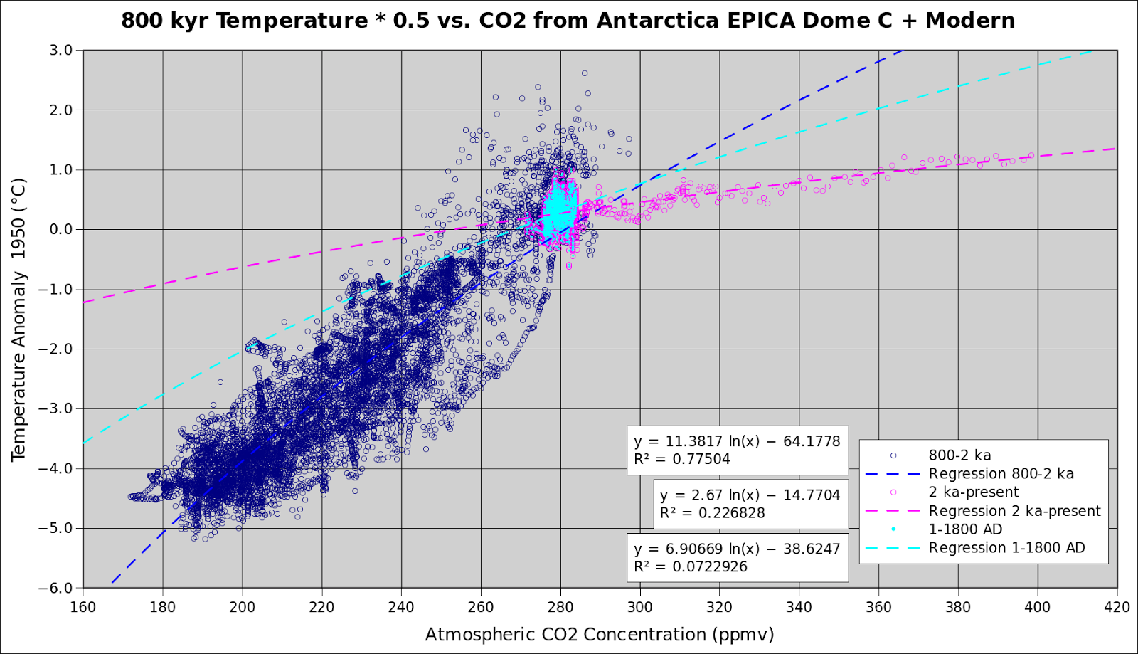 Essentially CO2 is “too good” in these bands. At 180 ppm or whatever in the glacial maxima those poor photons and their supporting thermalization could get a little higher in the atmosphere, but even then CO2 was gobbling them up and not letting them out to space.