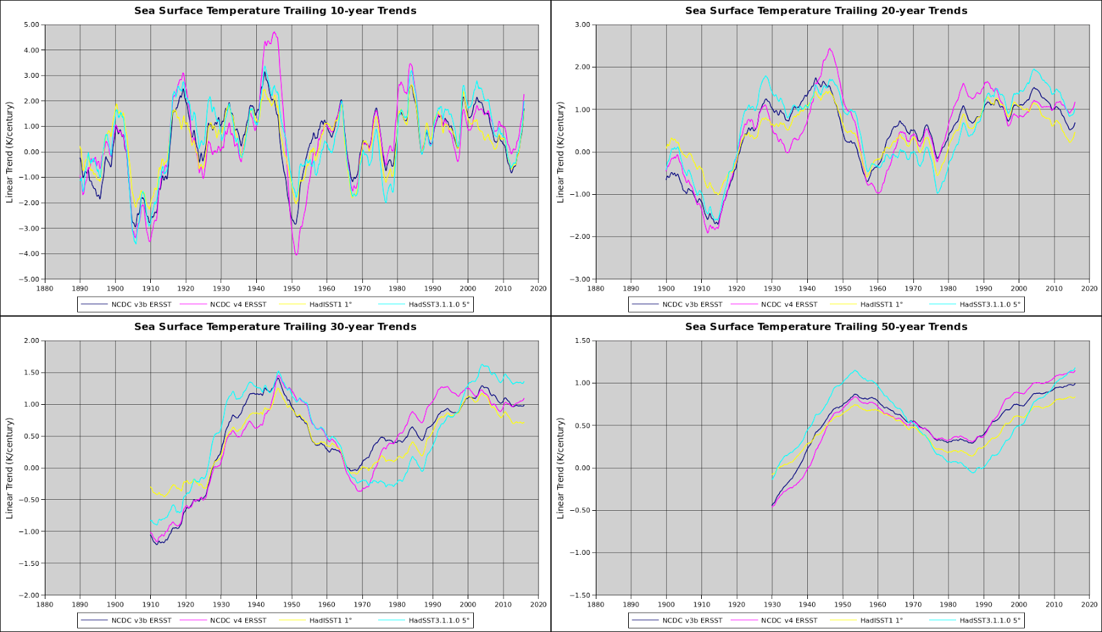 All of the blue graphs (HADSST3) have a text/numerical error. 1901-1950 should read 0.104 deg C/decade not 1.04 deg C/decade.