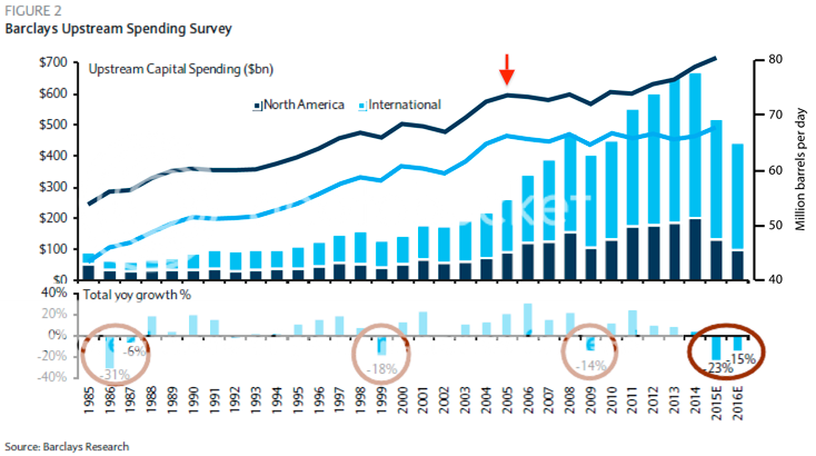 E&P companies are slashing capex, which in turn slashes their future production. History shows that the memories of these downturns lingers in the minds of E&P executives and their lenders, so that prices recover much faster than capex — and production.