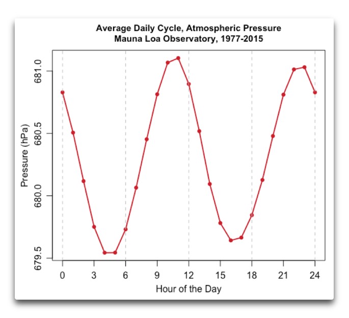 Anyhow, we’ve now finally gotten to my reason for writing this post. The figure below shows one more meteorological variable measured at Mauna Loa—the daily cycle in air pressures.
