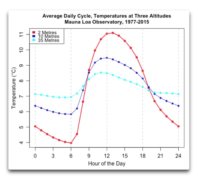Also, I was surprised that ten metres up in the air the daily variation is less than half of that down at two metres.