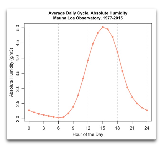 The reason that this was a surprise to me was that I had not expected it to vary that much. From a low of two grams per cubic metre at dawn, it more than doubles when it rises to a peak of five grams per cubic metre at three pm. Why is this important?