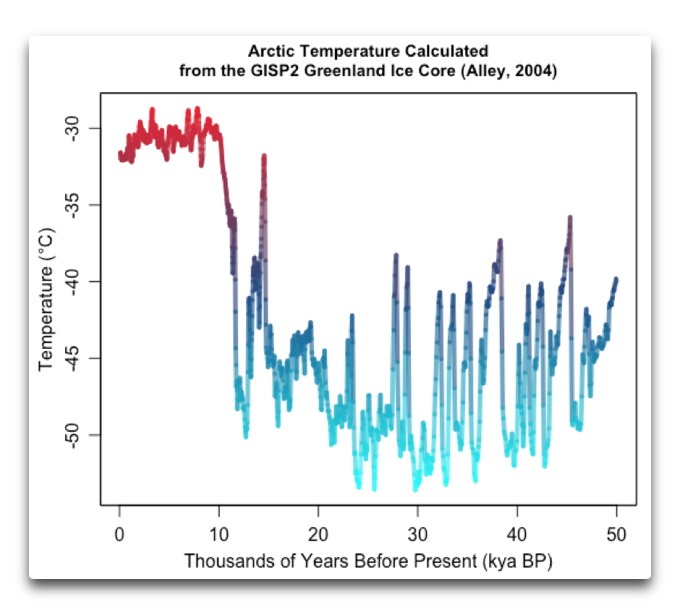 arctic temperatures estimated gisp2 alleyFigure 1. Temperatures calculated from the ∂18O oxygen isotope levels and borehole temperatures in the GISP2 ice core in Greenland.