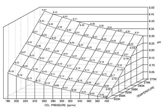 The graph below is a three-dimensional representation of P-pH-T data, similar to PVT graphs. The two-dimensional dependence of pH on either CO2 pressure or ocean surface temperature can be followed by looking at various isotherms or isobars; however, be sure to follow the graphs back to their original axes. For convenience, pH values at the intersection of these curves are given. It is obvious that to assume the drop in alkalinity of such a highly buffered system as our oceans is due to an uptake of atmospheric CO2 without taking the increase in ocean temperature, particularly in the Northern Hemisphere, into account is a very narrow interpretation of the science.