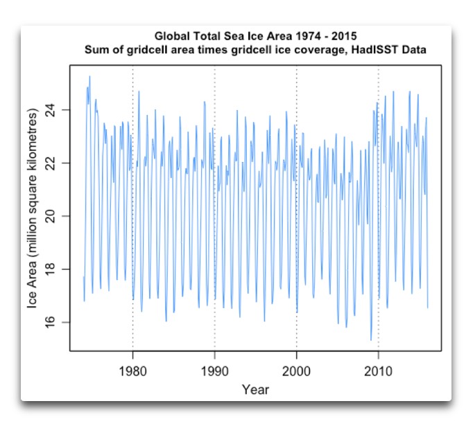 My examination of objects cryospherical continues. In my last post, The Size of Icy Reflections, I showed that a change of 10% in the global sea ice area translates into a global average of a 0.1 watt per square metre (W/m2) change in reflected sunlight. In this post, I’ll look at what that means given the historical changes in ice area. This will highlight the kind of the curious choices made in the analysis of climate data. To start with, here is the full data from the Hadley Ice and Sea Surface Temperature dataset (HadISST, data link below).