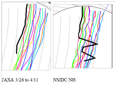This year winter seems to have started up again from the beginning of April in a LOT of places including about a third of the US, Parts of Canada, Russia, etc. If the Arctic resumed growing ice for a week in April, would we know it? The bits that are missing– that make the ice 7% below the mean are outside the main bowl. I guess there’s no followup by anybody w a camera to see what those areas by the Barentz Sea or the Bering look like, huh?
