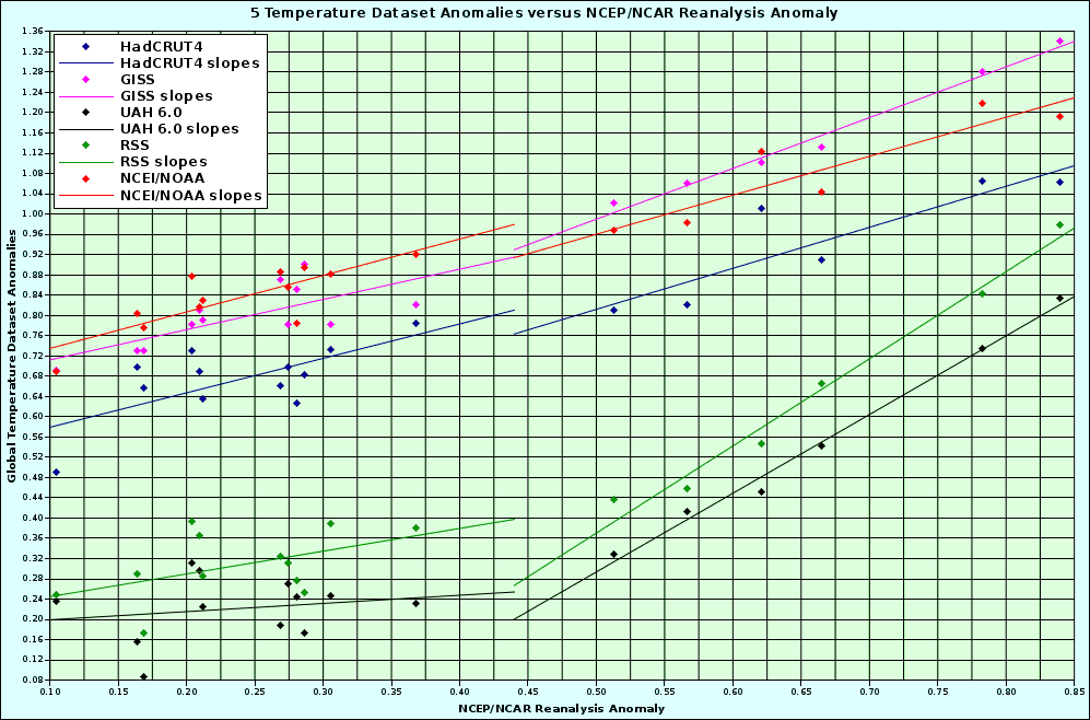 | Month | NCEP/NCAR | HadCRUT4 | GISS | UAHv6 | RSS | NOAA/NCEI |