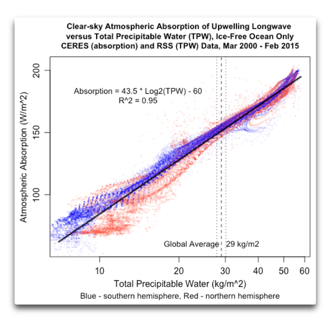 That is to say, we get a bit over two watts per square metre of increased absorption for every additional kilo of atmospheric water per square metre.