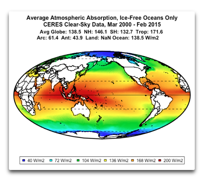 Figure 2. Average atmospheric absorption of upwelling surface longwave radiation, clear-sky CERES data. Calculated as the amount of longwave (infrared) emitted by the surface minus the amount observed at the top of the atmosphere.