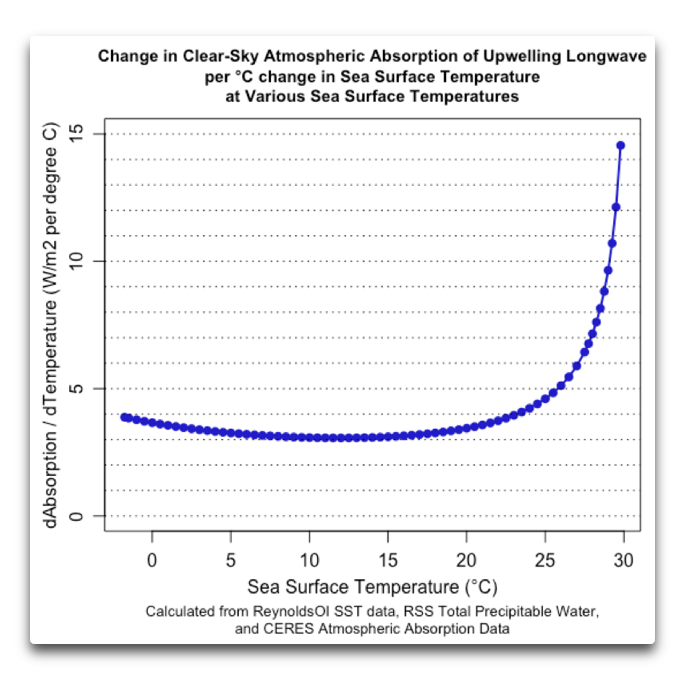Figure 3. Atmospheric absorption of upwelling longwave radiation versus sea-surface temperature. See end notes for mathematical derivation.