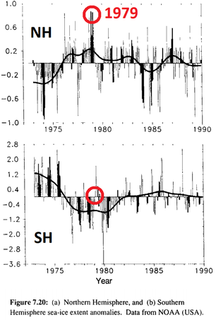 Inconveniently, however, the Nimbus 5 measurements show that Arctic sea ice extent was increasing during the chilly 1970s, and graphs of sea ice until about fifteen years ago showed 1979 as an anomalous peak. E.g., this is from the FAR (1990):
