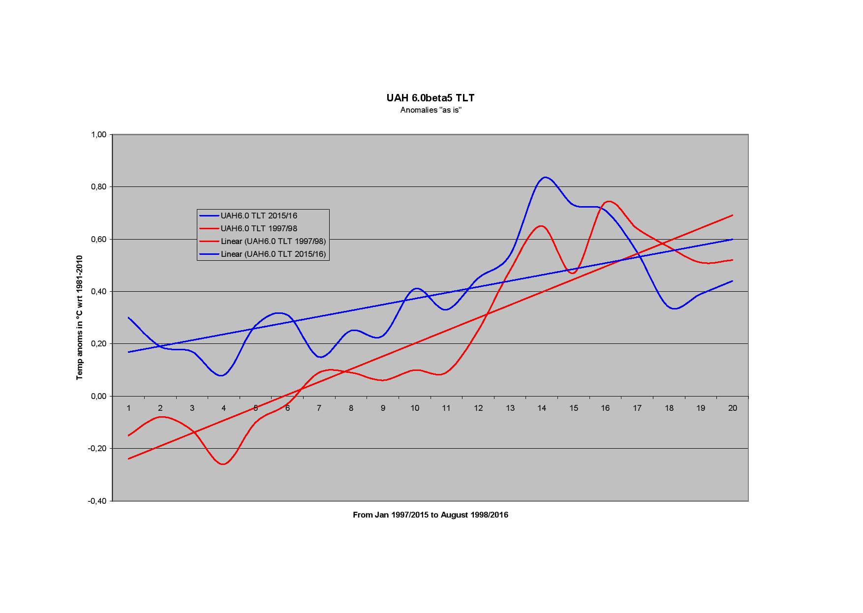 Suppose one moment that El Niño 1997/98 had never existed: you would then have had to compare, still based on UAH, ENSO’s 2015/16 edition with that of e.g. 1982/83 instead.