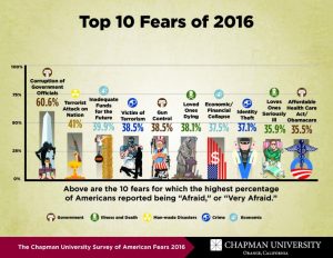 Chapman University recently completed its third annual Chapman University Survey of American Fears (2016). The survey asked respondents about 65 fears across a broad range of categories including fears about … Continue reading Survey lists Top 10 American Fears – government corruption is #1, global warming doesn't make the cut