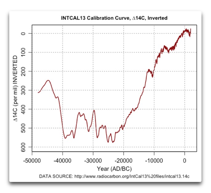 The interesting thing about that curve is that if you have a d14C measurement of 400 per mil you can choose between 14ka and 43ka !