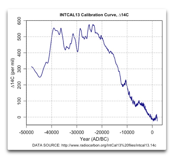 So let me start, as I prefer to do, with the largest, longest view of the underlying raw data. In this case it is something called the “INTCAL13 Calibration Curve”. It is a record of historical variations in the levels of the carbon isotope 14C.