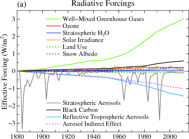 Earth’s carbon cycle contains 46,713 Gt (E15 gr) +/- 850 Gt (+/- 1.8%) of stores and reservoirs with a couple hundred fluxes Gt/y (+/- ??) flowing among those reservoirs. Mankind’s gross contribution over 260 years was 555 Gt or 1.2%. (IPCC AR5 Fig 6.1) Mankind’s net contribution, 240 Gt or 0.53%, (dry labbed by IPCC to make the numbers work) to this bubbling, churning caldron of carbon/carbon dioxide is 4 Gt/y +/- 96%. (IPCC AR5 Table 6.1) Seems relatively trivial to me. IPCC et. al. says natural variations can’t explain the increase in CO2. With these tiny percentages and high levels of uncertainty how would anybody even know? BTW fossil fuel between 1750 and 2011 represented 0.34% of the biospheric carbon cycle.